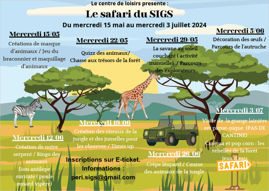 Nous vous présentons le programme des mercredis de cette dernière période de l’année 2024 qui sera sur le thème du « Safari ».