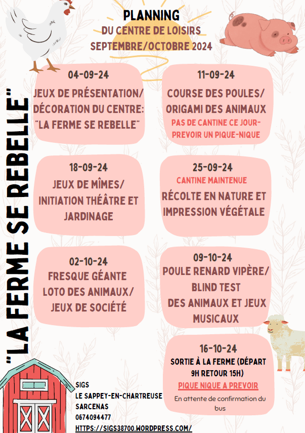 Aussi l’équipe tente de reprogrammer une sortie à la ferme de Saint-Germain, le mercredi 16 octobre. Nous reviendrons vers vous pour plus de précision.