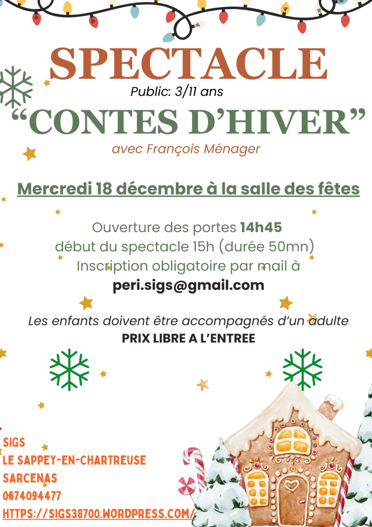 Le SIGS organise pour cette fin d’année un spectacle pour vos enfants le mercredi 18 décembre à la salle des fêtes. Inscription demandée par mail ou par téléphone.